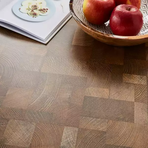 The modern-meets-classic design of this round dining table is perfect for small spaces. With an elegant wood parquet effect tabletop and four steel powder-coated legs, it’s both beautiful and sturdy.