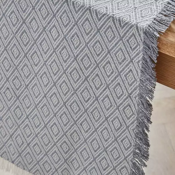 Part of the Oslo collection, this table runner has been finished in a modern grey colourway with contrasting fringing detailing. Styled in a contemporary geometric design, this table runner is fully machine washable for ease of cleaning with coordinating items available to purchase separately.