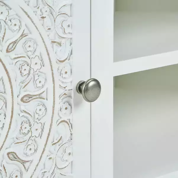 Finished in a white colourway, the Samira Corner TV Unit features two spacious fixed shelves, as well as additional storage space behind the decoratively carved door. This unit is perfect for fitting into compact spaces, so you can make the most of your living room.