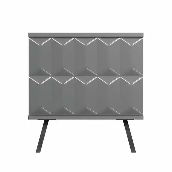 Featuring push to open doors with internal shelving to store away all your bits and bobs, this deep textured contemporary table has a high-gloss painted finish with unique smoked chrome legs. Suitable for many rooms as it’s perfect to use as a lamp table or bedside table.