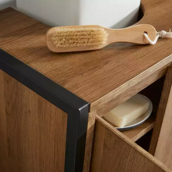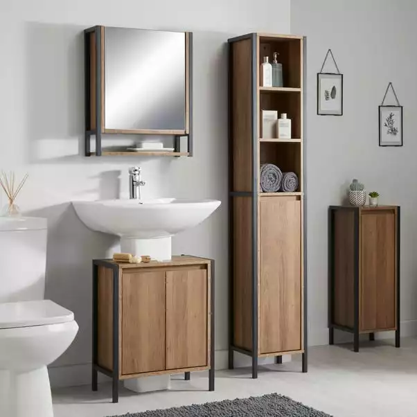 Boasting an oak effect and black metal frame this under sink unit gives your bathroom a ultra modern finish whilst also providing your bathroom with ample storage space. This unit includes 2 internal shelves that are ideal for organising all your bathroom toiletries. With a sleek handle-free design this under sink unit fits snuggly under most standard sinks.
