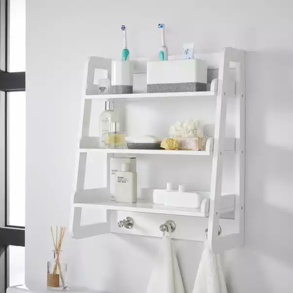 Boasting a clean, crisp painted finish, this shelving unit is perfect for storing and showcasing all your bathroom essentials. With a timeless design, that would compliment any bathroom interior, you can style these shelves however you like. With stylish chrome hooks and three shelves in a ladder formation, this shelving unit provides you with ample storage space. This unit is easy to assemble and is also available in grey.